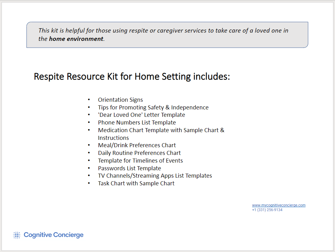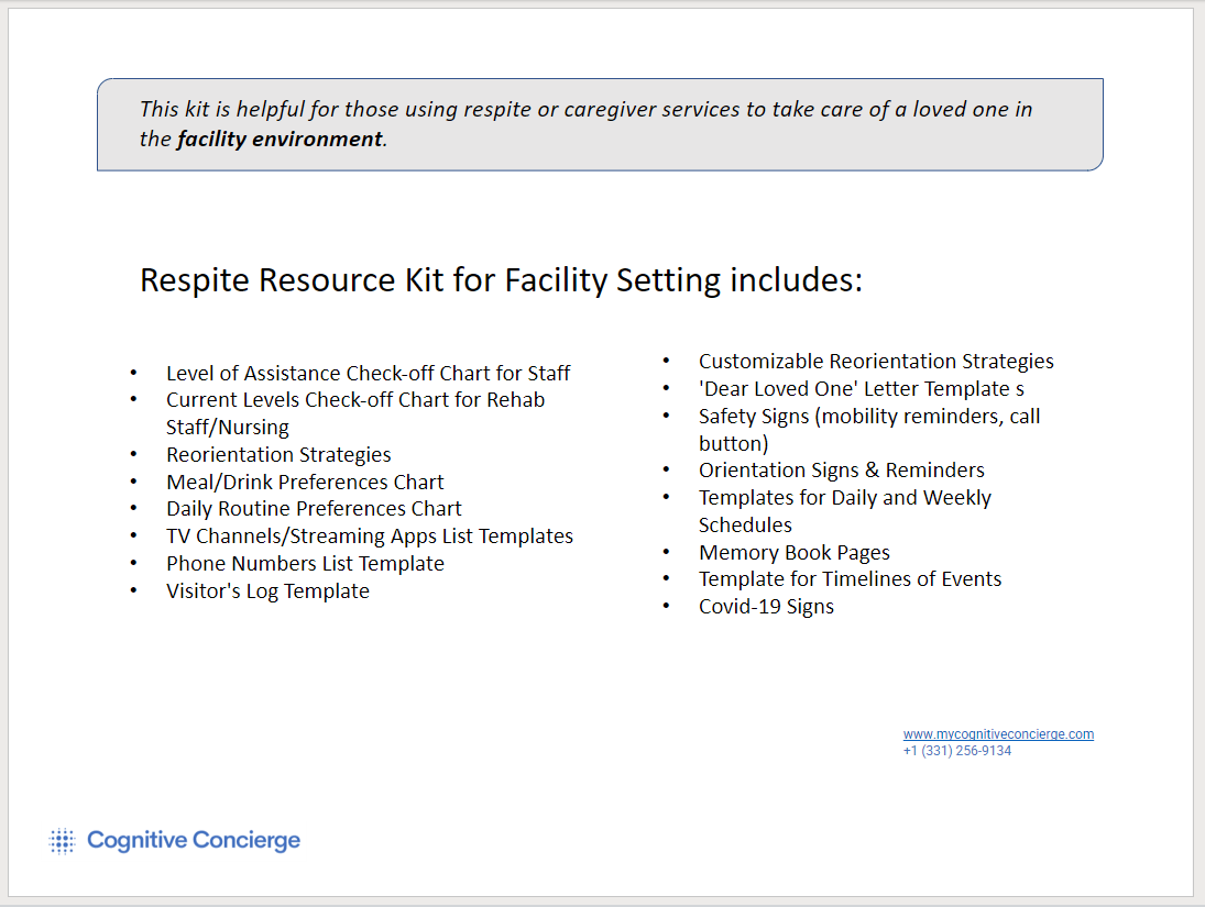 Respite Resource Kit Includes two sections. One for using in the home and one for using in a facility setting. You will receive both sections of this kit with your purchase.